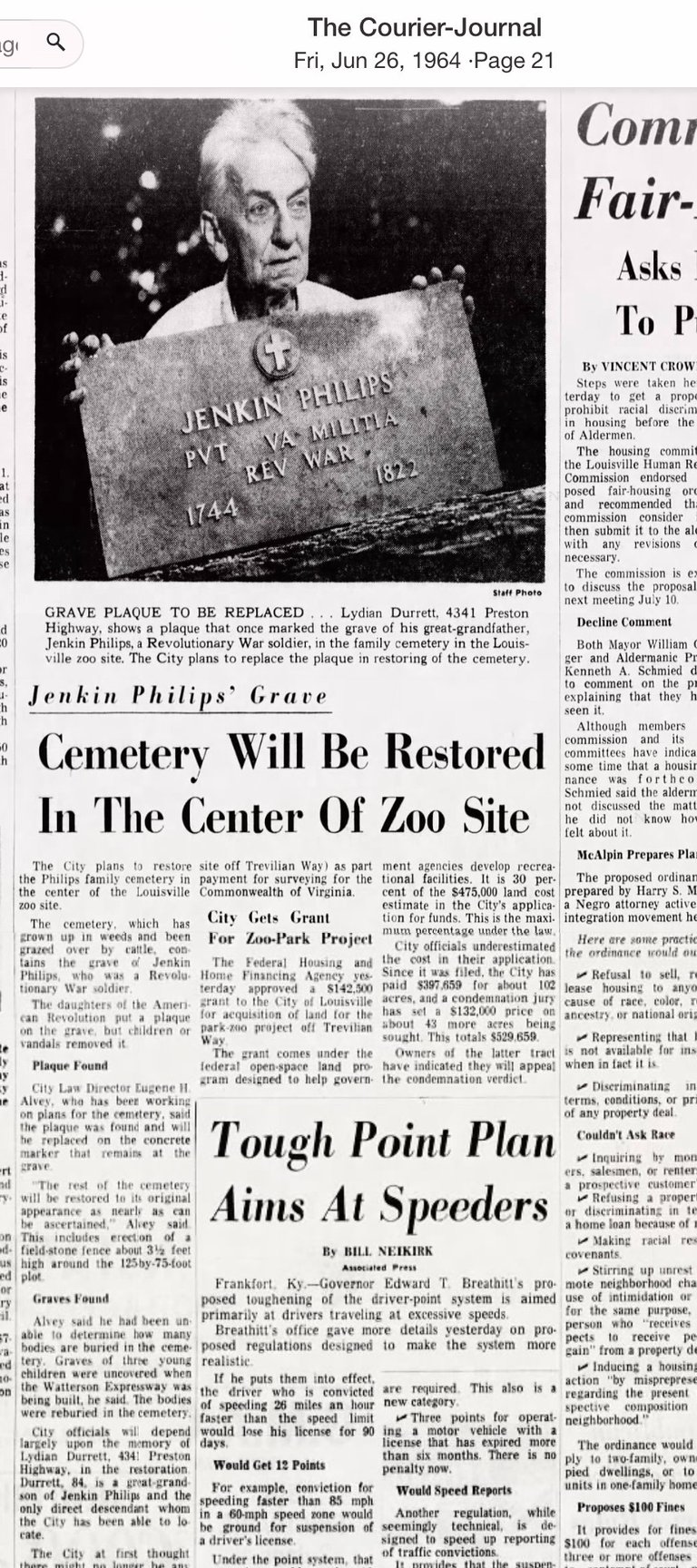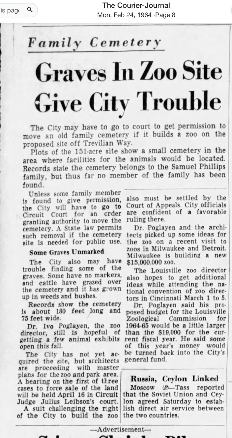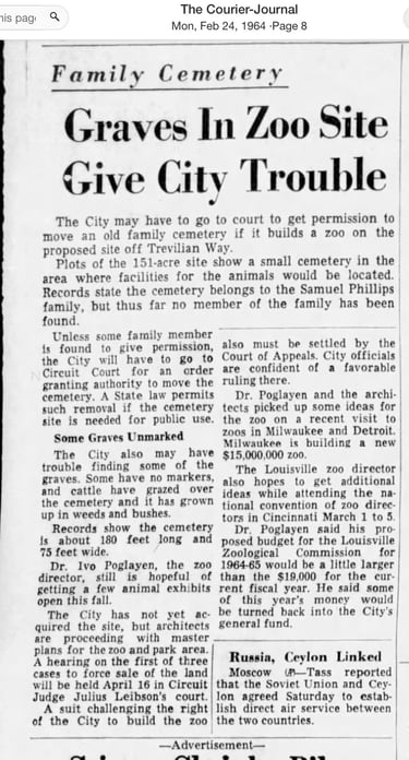 When the City of Louisville acquired the land to build a new zoo in the late 1960s, workers accidentally uncovered this long-forgotten family cemetery. Instead of relocating the graves, the city decided to preserve the site in honor of its historical value. A living descendant of Jenkin Phillips still lived in the area at the time and may have planned to be buried beside her ancestors. Out of respect, the city incorporated the cemetery into the landscape of the new zoo, which officially opened in 1969.