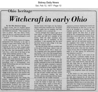When the day of the trial arrived, the townspeople gathered at what is now the intersection of State Routes 125 and 232. A heavy Bible was placed on one side of the scale, and Nancy Evans was seated on the other.
